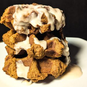 • Using a cookie scoop, scoop 1-4 scocps of batter into each waffle section (depending on your size preference and depending on the size of your waffle iron. Cook 4-6 min until golden and cooked through.